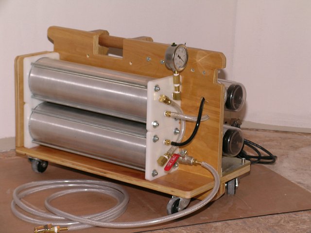 Carl Davis of Savannah, GA built this updated version of the vacuum press using a double reservoir system and swiveling casters. |