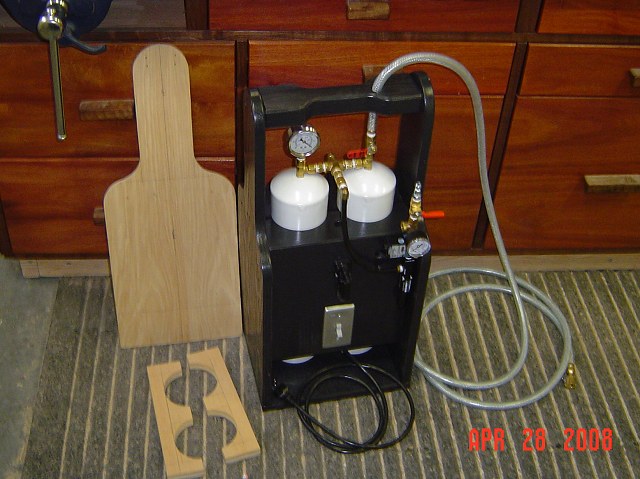 From the builder, Marlin Wegner, "It's mounted in an old computer case. The cover for the case is still part of the press, but I have removed it for the pictures. The tank is an old fire extinguisher that I had welded shut and then tapped for hoses. The case also has handles for lifting and wheels for easy moving. It works very well for veneering guitar tops." |