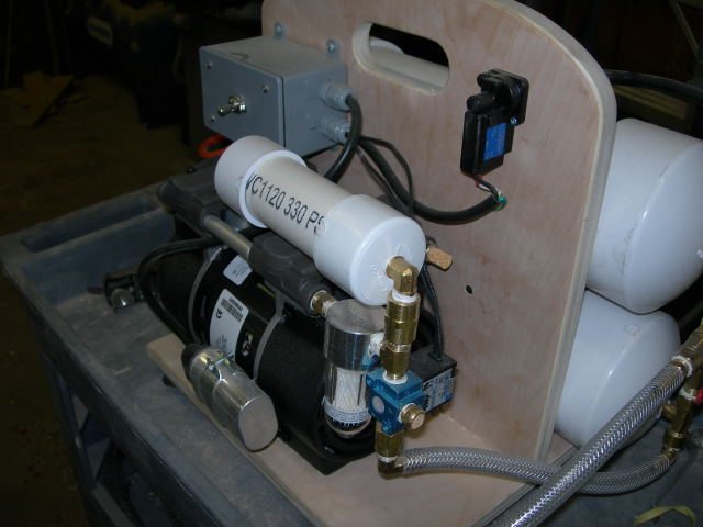 The builder of this unit opted to weld a box to the side of a spare compressed air tank for use as a reservoir. I have also seen a reservoirs made from old propane tanks! |